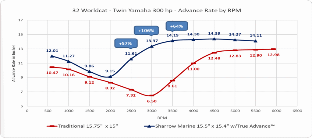True Advance™ is a design feature within all Sharrow™ Propellers that contributes to the incredible efficiency and performance of the Sharrow Propeller™. It allows our propellers to achieve their maximum advance rate and efficiency much earlier on in the RPM and speed range of a boat compared to standard propellers. The benefits of Sharrow True Advance™ include: