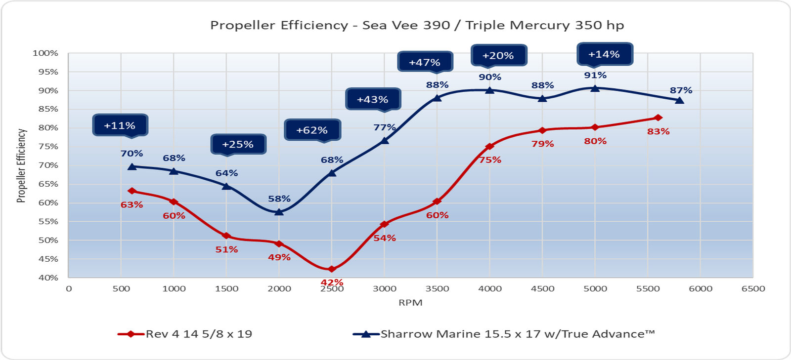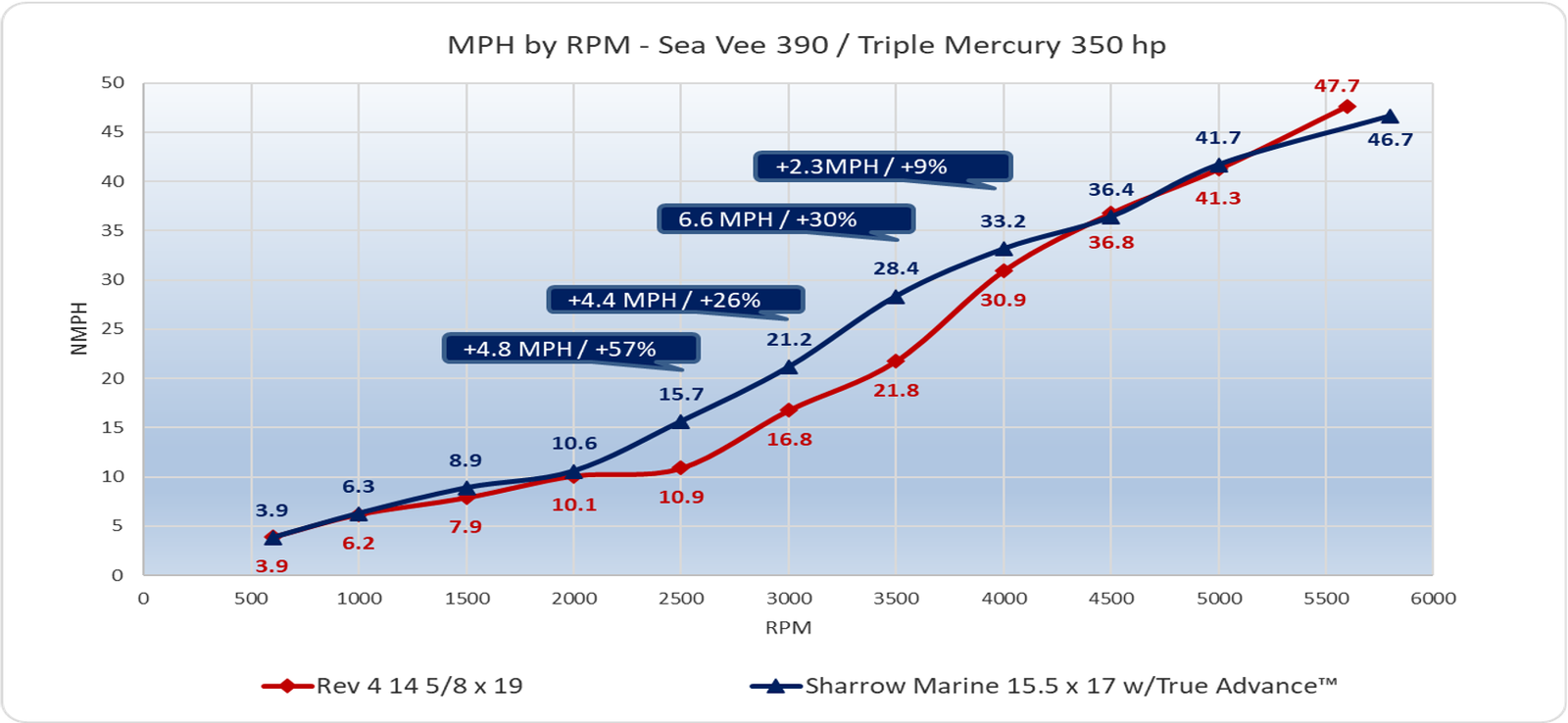 Not to mention a completely transformed mid-range, where this boat can cruise at 28.4 MPH at 3500 RPM with the Sharrow Propeller, compared to only 21.8 MPH at 3500 RPM with the standard prop.